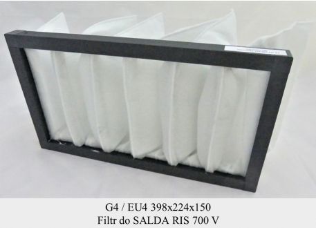 Cena dotyczy 1szt. filtra. Filtr kieszeniowy klasy G4 / EU4 o wymiarach 398x224x150 mm do centrali SALDA RIS 700 V Według karty katalogowej standardowo montowany zestaw filtrów to 1 szt. filtra EU5 398x224x280mm + 1szt. filtra EU3 398x224x150mm. Przed zakupem prosimy o weryfikację wymiarów filtrów podanych w ofercie z rzeczywistymi wymiarami filtrów montowanych w centrali. Produkt jest zamiennikiem. Nazwy urządzeń, części i marek zostały użyte w celu identyfikacji produktu.