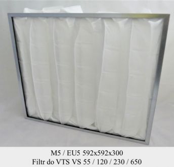 Filtr kieszeniowy klasy M5 / EU5 o wymiarach 592x592x300 mm w ramce metalowej pasujący do central VTS: VS 55 VS 120 VS 230 VS 650 Filtry są zamiennikami, nazwy producentów i marek zostały użyte w celu identyfikacji produktu.